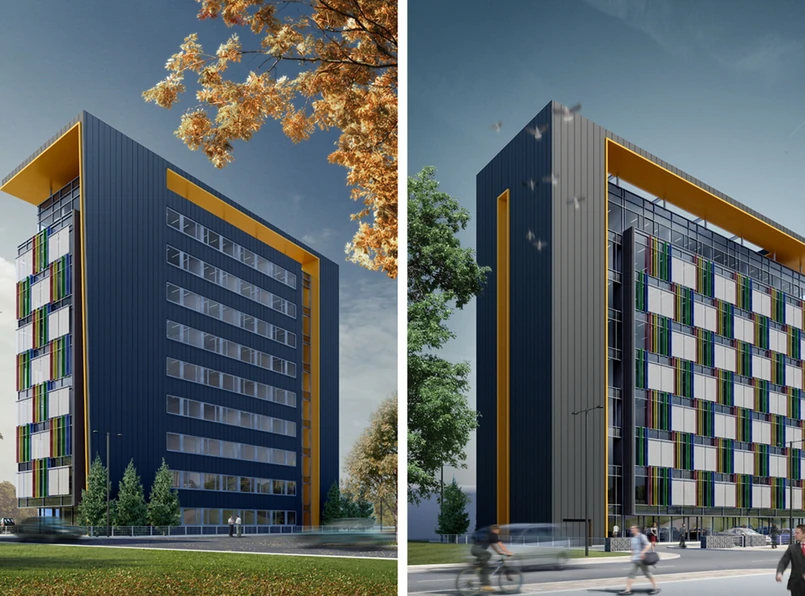 Tym, co zwraca uwagę na pierwszy rzut oka, jest wielobarwna elewacja. Na przeszklonej fasadzie pojawią się panele w kolorach: czerwonym, żółtym, zielonym i niebieskim. Biurowiec będzie miał niemal 4 tys. mkw. powierzchni rozmieszczonej na 9 kondygnacjach. W podziemiach budynku zaplanowano garaż podziemny, który pomieści 26 samochodów. Kolejne 11 aut zaparkuje obok budynku.