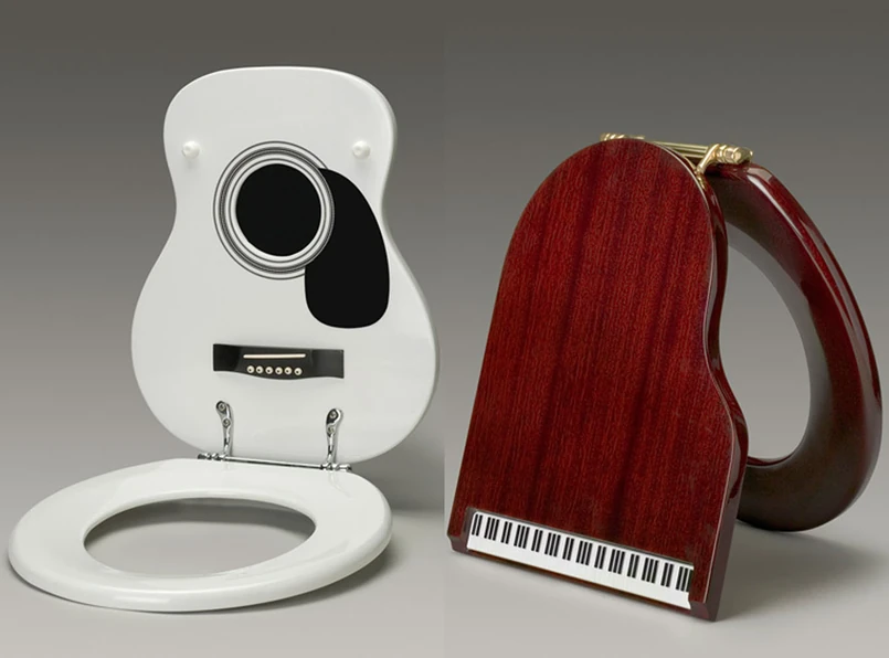 Muzyczna łazienka to pomysł nie tylko dla audiofila, ale to na pewno ta grupa wykaże największe zainteresowanie. W sklepie www.jamminjohnes.com można nabyć oryginalne deski klozetowe w kształcie gitary klasycznej lub elektrycznej albo fortepianu.