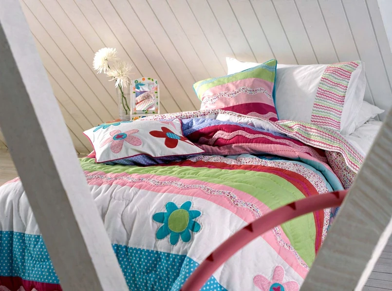 Elementem rzucającym się w oczy i natychmiast zmieniającym charakter pokoju jest pościel i zasłony. Romantyczna pościel z kwiatowymi elementami lub aplikacjami stworzy klimat. (http://www.kidstown.pl/category/16,narzuty-dla-dzieci). Uzupełnią go drobne elementy – wieszak na ścianie czy ramka obrazka.