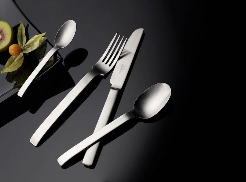 Sztućce „One” marki Villeroy & Boch łączą w sobie ostrą geometrię i lekko zaokrąglony kształt. Jak zapewnia producent, to stanowczo męski produkt. Skąd ten wniosek? Kolekcja wykonana jest z matowej stali nierdzewnej i została zaprojektowana w taki sposób, aby kształt elementów wyraźnie nawiązywał do figur geometrycznych. Np. ostrze noża zainspirował prostokąt, główkę łyżki zaś wąski owal.