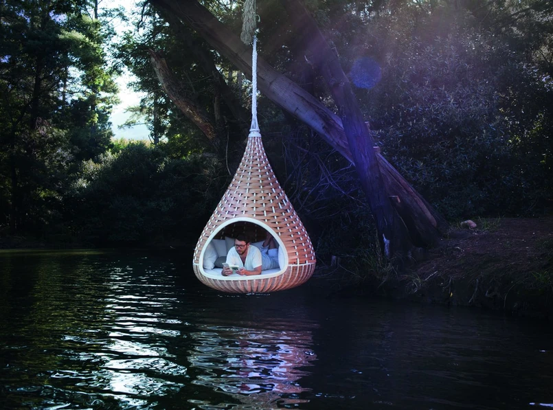 Sączące się do wnętrza przez niewielkie szczeliny promienie słońca, wygodne poduchy i miękki materac. Jakby tego było mało, przyjemne bujanie przy każdym podmuchu wiatru. Takie doznania gwarantuje nam najnowsza rodzina produktów marki Dedon. Linia Nestrest to nic innego jak olbrzymie kokony, które w swoim wnętrzu kryją prawdziwy relaks. Idealne na popołudniowe drzemki na świeżym powietrzu, medytacje czy też relaks ze znajomymi. Aluminiowy stelaż opleciony jest specjalnym włóknem. Wnętrze kokonu zaś wyściełane miękkimi tkaninami. Kto nie ma odpowiedniego drzewa, aby zawiesić na nim Nestrest, może wybrać opcję stojącą.