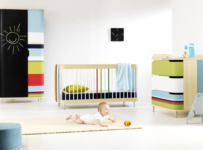 Do komody zaś możemy umocować przewijak, kiedy nie będzie już potrzebny, mebel nadal doskonale sprawdzi się jako pojemna szafka z szufladami. Jej zaokrąglone rogi chronią dzieci przed groźnymi wypadkami, a jednocześnie sprawiają, że mebel wygląda bardzo estetycznie. Jedno ze skrzydeł ostatniego elementu zestawu – czyli dwudrzwiowej szafy – to tak naprawdę duża tablica, która przyda się i starszym i młodszym. Za zakupem przemawia także sama forma. Jaskrawe kolory i proste wzory w pasy sprawiają, że meble nie są infantylne i doskonale wyglądać będą w pokojach dużo starszych dzieci.