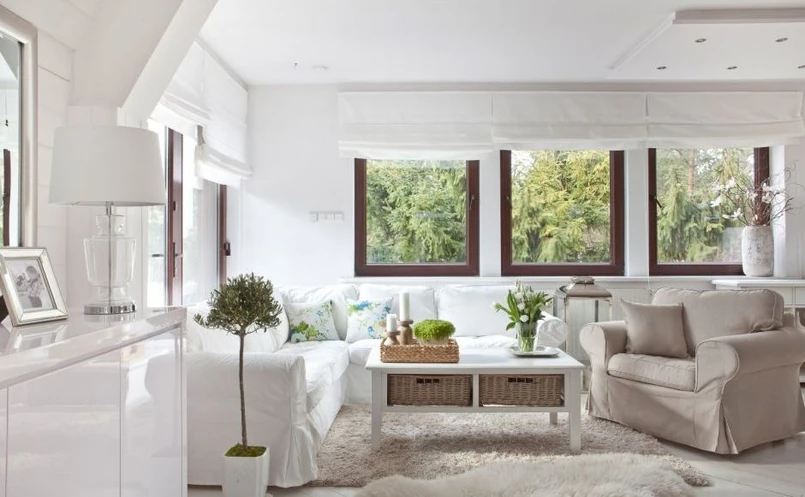 Zbyt dekoracyjna aranżacja okna sprawia, że cały pokój wydaje się ociężały. W małych wnętrzach lepiej wybrać rolety rzymskie, które nie przytłaczają wnętrza i elegancko się prezentują. Jeśli chcemy, możemy również połączyć rolety z lekkimi zasłonami. Najlepiej jednak, aby były one z jasnej, półprzeźroczystej tkaniny.