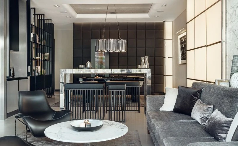 - Zastosowaliśmy niespotykane materiały takie jak palone drewno shou gi ban, tłoczoną w drobne kwadraciki metalową blachę czy przestrzenne srebrno-białe tkaniny rodem z mody sportowej – wymienia Anny Wojczyńska ze studia Vis-a-Vis. - Nieoczywiste jest też łączenie materiałów. Jak beton z marmurem, eleganckimi skórami czy też dużymi spiekami mieniącymi się srebrnymi kropeczkami.