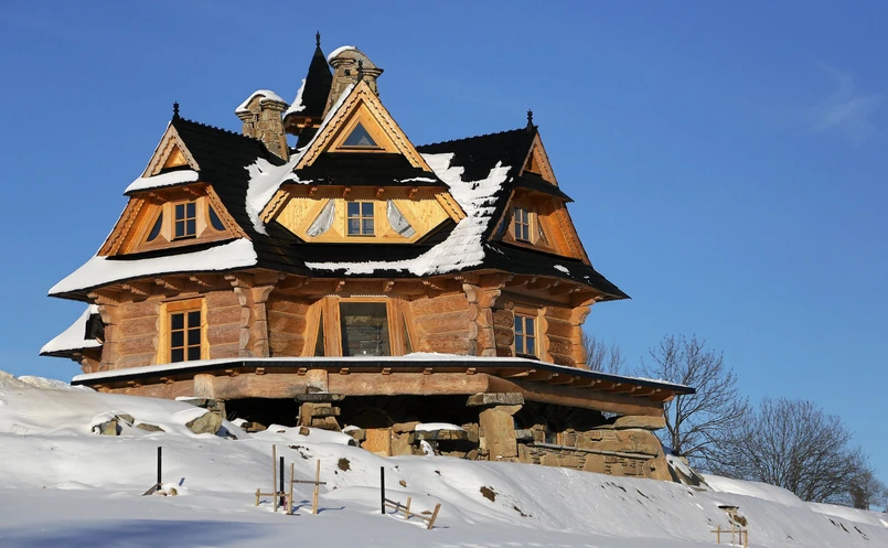 Budynek został wzniesiony z drewna, dokładnie "z pięciu belek, czyli tzw. płazów. Każda z nich jest inna od pozostałych, a w dodatku nie wszystkie ułożone są pod kątem prostym", informuje Ladnydom.pl. "Kamieniarka ułożona z kilkutonowych głazów także stanowi o atrakcyjności budowli. Wszystkie elementy to rękodzieło i praca lokalnych artystów-mistrzów".