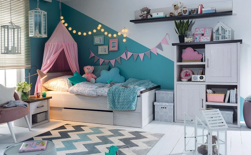 Kompromis jest złotym środkiem do osiągnięcia idealnego efektu - i tak na przykład, kiedy maluch marzy o tym, aby mieć w pokoju swój własny namiot, a my nie mamy do dyspozycji zbyt wiele miejsca, możemy zaproponować mu np. podwieszany baldachim nad łóżkiem. To idealna alternatywa dla tradycyjnego tipi. Taki baldachim w dziewczęcym różowym kolorze będzie świetnie prezentował na tle mebli z kolekcji Luca Juzi, w charakterystycznym prowansalskim stylu. Połączenie bielonego dekoru drewna i prostej konstrukcji na pewno docenią rodzice, którzy cenią rozwiązania ponadczasowe. W ramach kolekcji dostępne są m.in. praktyczne biurko, łóżko z dodatkowymi szufladami na pościel, pojemna szafa, komody i regały, które pozwolą utrzymać porządek w tej wielofunkcyjnej przestrzeni. Kolekcja Luza Juzi jest też na tyle uniwersalna, że sprawdzi się zarówno w pokoju dziewczynki, jak i chłopca.