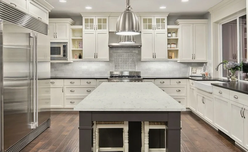 Po drugie – dobrze urządzona kuchnia w amerykańskim stylu musi mieć porządne blaty. Nie ma mowy o laminacie. Blat powinien być solidny.