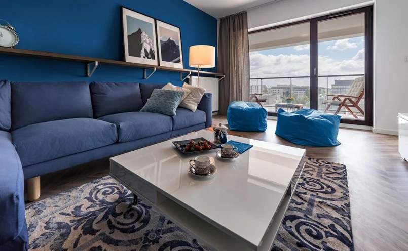 Przeciwwagą dla palety błękitów są elementy w kolorze naturalnego drewna – podłogi, stolik kawowy, półki, zasłony i ramy obrazów. Na pierwszy plan wysuwa się w tym zestawieniu dywan – jedyny wzorzysty element aranżacji, który, pozornie jakby z innej bajki, wnosi do wnętrza niepowtarzalną dynamikę, podbitą stylistyką nowoczesnych grafik – dodaje Maciej Skupiński z KODO.