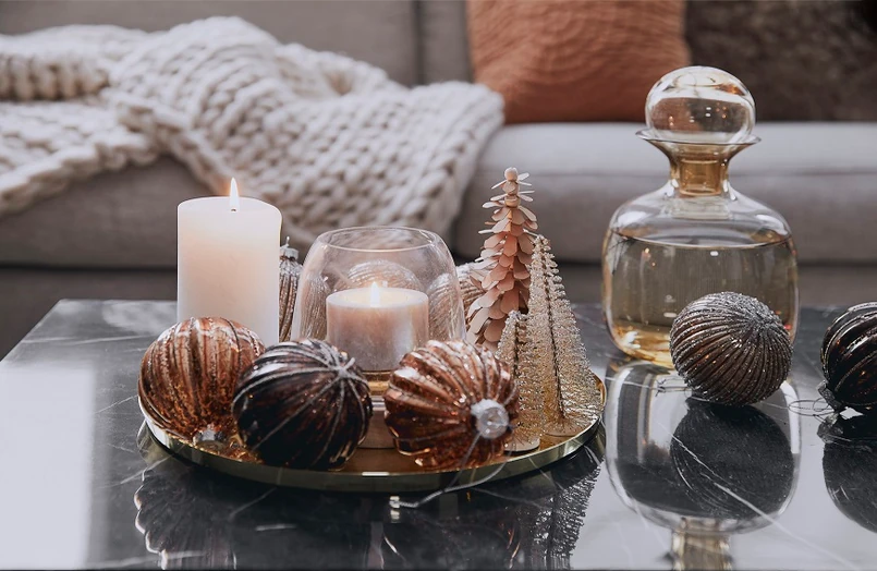 Ułóż na tacy ulubione bombki, świeczki lub inne ozdoby, tworząc z nich oddzielną dekorację. Możesz ją postawić na stole lub komodzie, a także łatwo przenosić z jednego miejsca w drugie.