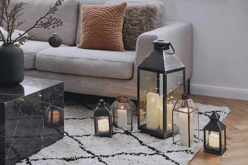 Postaw obok siebie latarenki różnej wysokości i wstaw do nich świece o sezonowych zapachach. W ten sposób wyczarujesz magiczną atmosferę po zmroku.