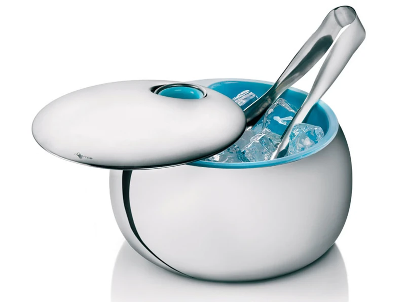 Uroda nie jest jedyną zaletą kubełka duńskiej firmy Nuance. Projektanci zbudowali go ze stali nierdzewnej, ma podwójne ścianki, dzięki czemu lepiej izoluje i sprawia, że kostki wolniej się rozpuszczają. Pojemnik jest sprzedawany z elegancka pokrywką, w której znajduje się otwór na dołączone do zestawu szczypce.
