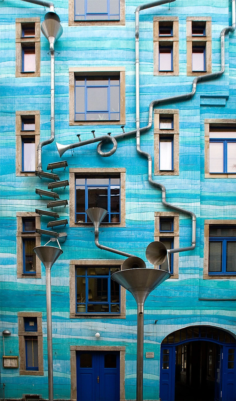 1 Nietypowy budynek jest efektem współpracy trzech artystów: Annette Paul, Christopha Rossnera i Andre Tempela. Niektórzy twierdzą, że inspiracją dla nich stała się architektura Wielkiej Brytanii - to tam spotkać można bardzo długie rynny lub, jak uważają inni, Rosji. W Petersburgu na przykład z reguły rynny są duże i powykręcane w fantazyjne kształty.
