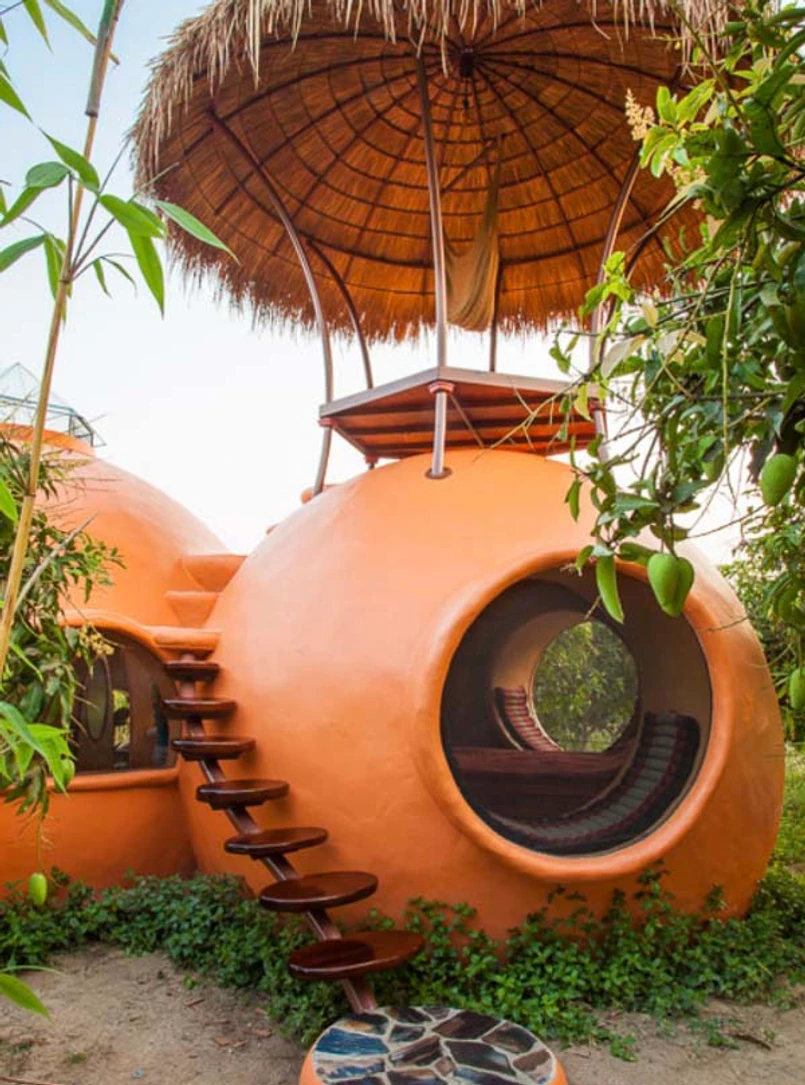 8 Na dachu niższej kopuły znalazło się miejsce na mały taras, gdzie można odpoczywać na hamaku w cieniu ogromnego parasola z palmowych liści.