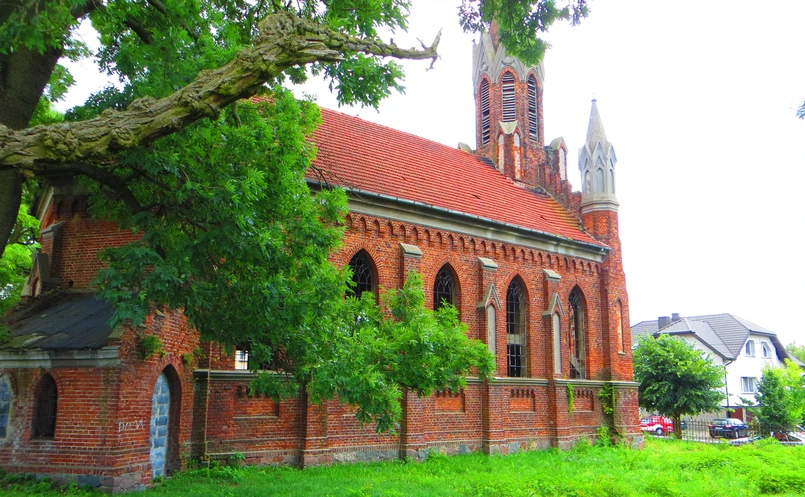 Budynek położony jest przy głównej drodze – dobrze widoczny z daleka, bo zbudowany z cegły, w stylu neogotyckim i kryty dachówką karpiówka. I, co też widać od razu, w złym stanie – "wymaga remontu w szczególności dach", można jeszcze do dziś przeczytać w ogłoszeniu. Wiadomo, że wzniesiono go w latach 1907-1909 i jeszcze po wojnie odprawiano w nim nabożeństwa w obrządku ewangelickim.